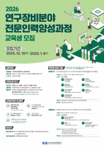 Notice 2026년 연구장비분야 전문인력양성과정 교육생 모집 0Views 2025.12.12 (금) 2026년 연구장비분야 전문인력양성 과정 교육생을 모집합니다. Download 2026년_연구장비분야_전문인력양성과정_교육생_모집_공고문_1120_최종-1.hwp Previous Post No post. Next Post [HPXRD] is not available.