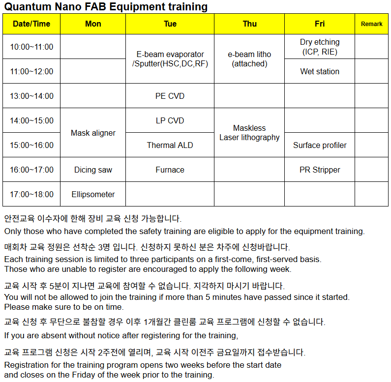 Nano Fabrication Center◈ 2026 Cleanroom Equipment training Schedule (4/6~ 4/10)