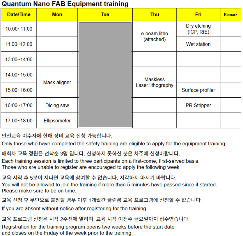 Nano Fabrication Center◈ 2026 Cleanroom Equipment training Schedule (5/4~ 5/8)