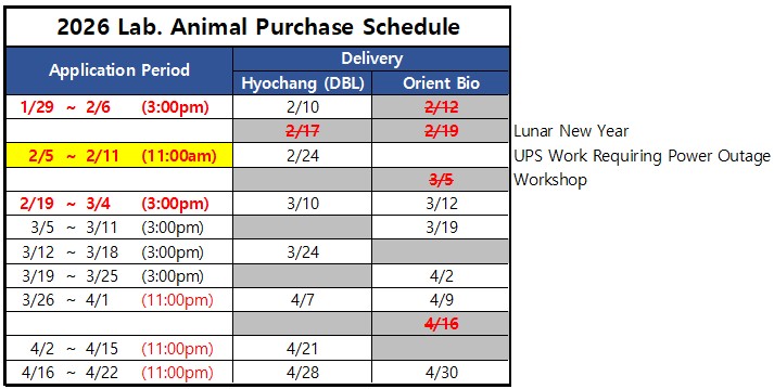 2026년 실험동물 구입일정 및 주문 방법 (Lab. Animal Purchase Schedule & How to order)