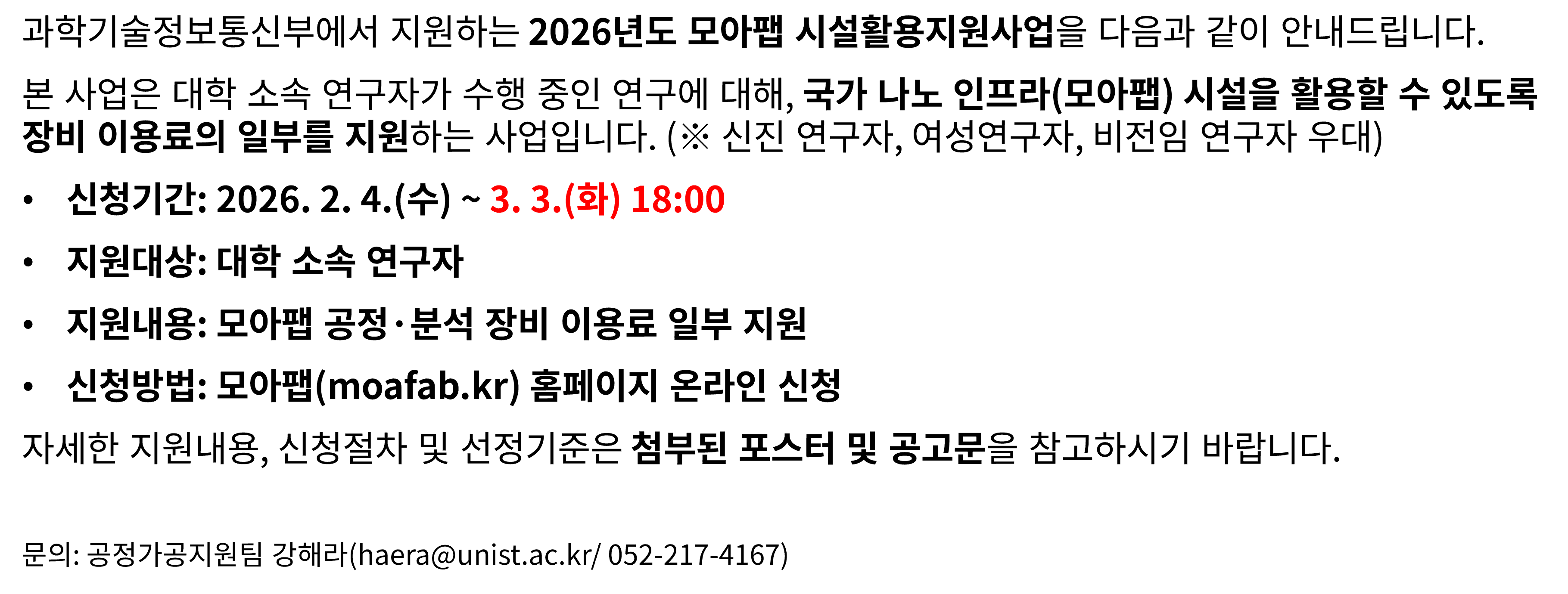공지사항 2026년도 모아팹 시설활용지원사업 안내 27조회 2026.02.09 (월) Download 2026년도-모아팹시설활용지원사업-공고문-1.pdf Previous Post Bruker 600 MHz FT-NMR is not working Next Post 2026년 실험동물 구입일정 및 주문 방법 (Lab. Animal Purchase Schedule & How to order)