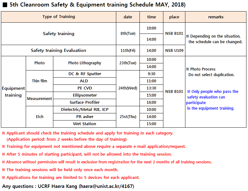 Nanofabrication Lab■ 5th Cleanroom Safety training Schedule (MAY, 2018)