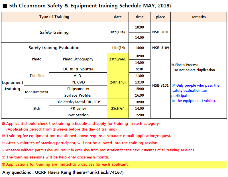 Nanofabrication Lab■ 5th Cleanroom Equipment training Schedule (MAY, 2018)