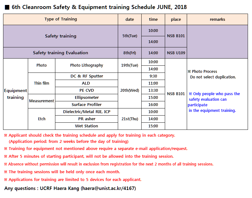 Nanofabrication Lab■ 6th Cleanroom Equipment training Schedule (JUNE, 2018)
