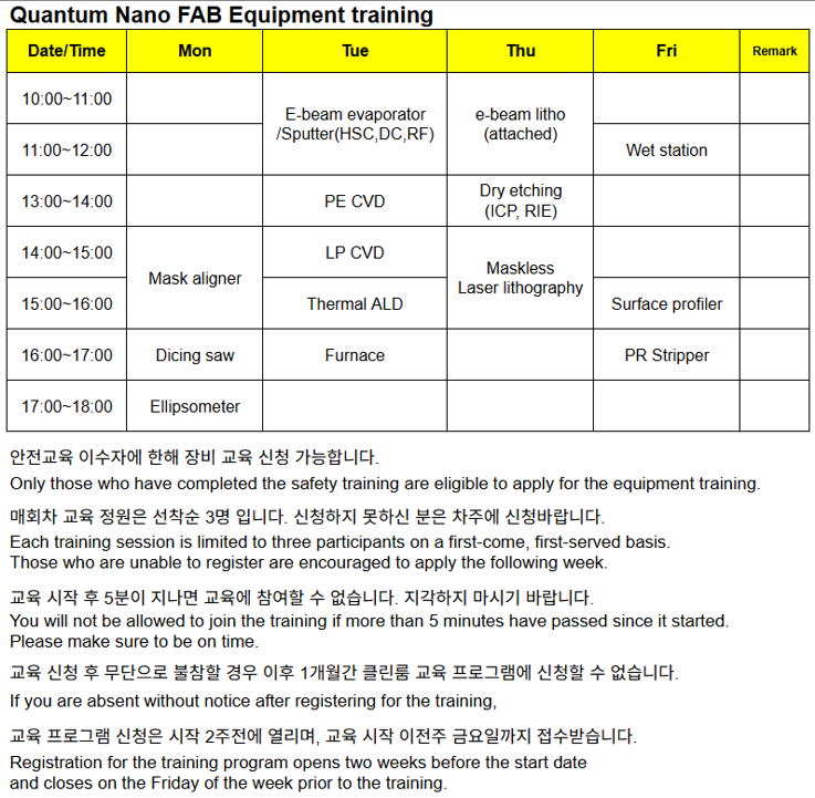 Nanofabrication Lab◈ 2025 Cleanroom Equipment training Schedule (12/1 ~ 12/5)