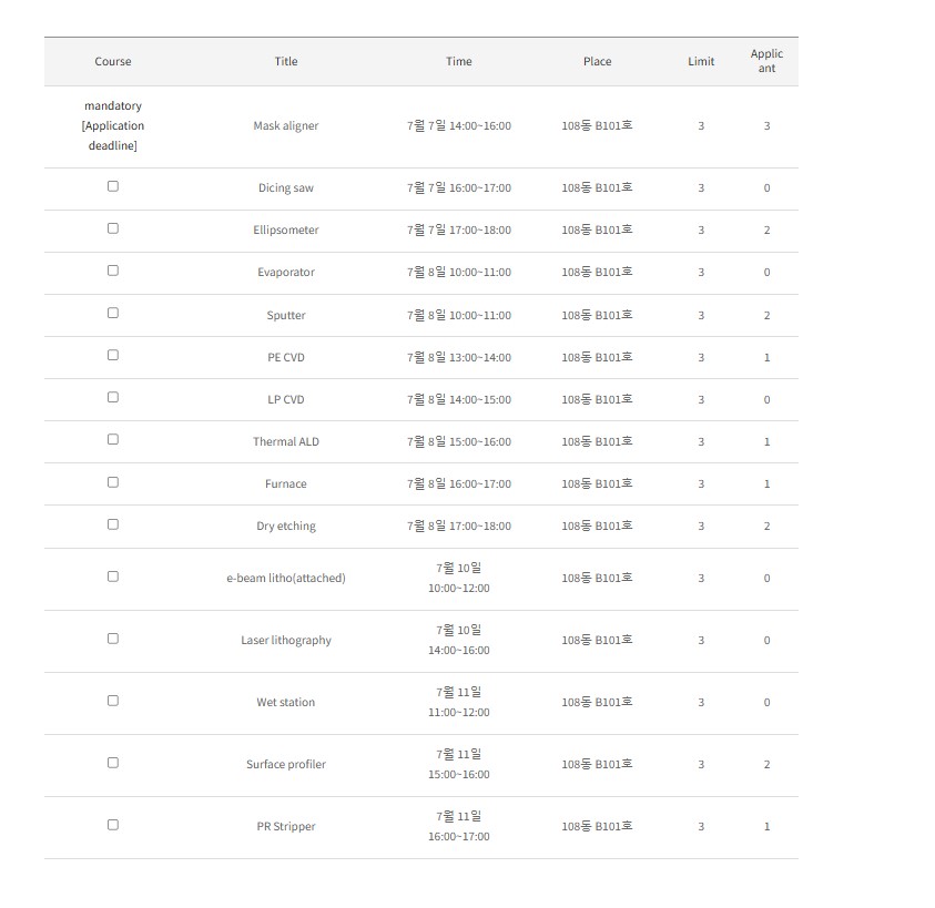 클린룸 장비 교육 신청을 하려고 했는데 apply 버튼이 없어서 신청을 하지 못하고 있습니다.
